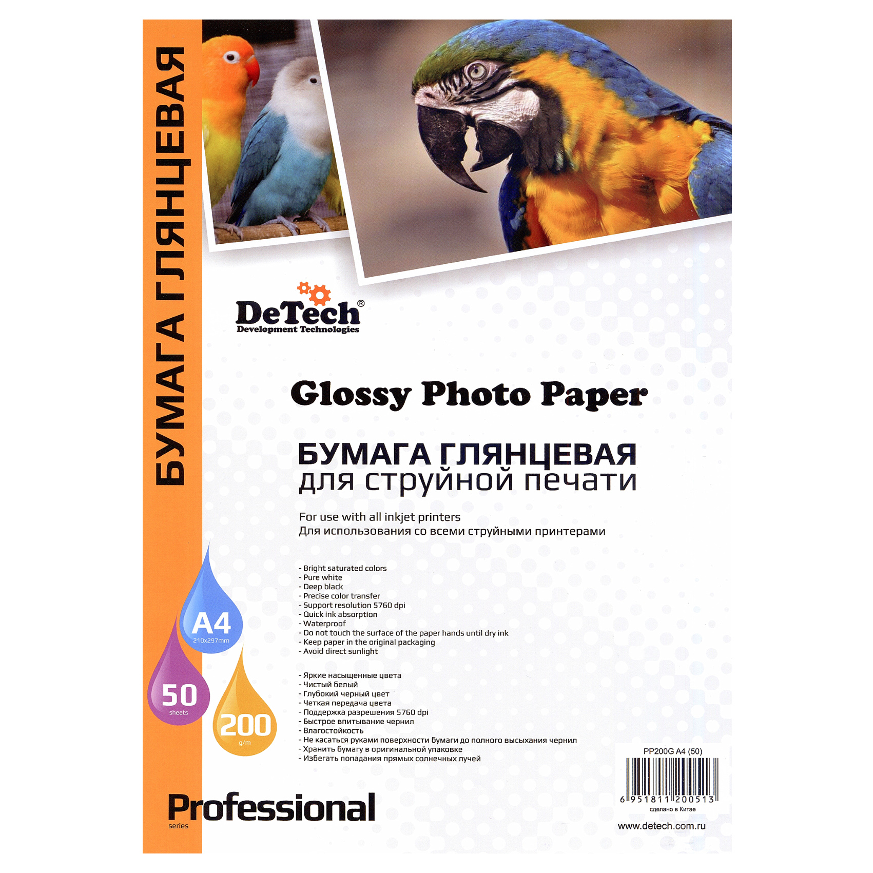 Фотобумага DeTech 200gm2, glossy, A4, 50л (PP200G A4 50)