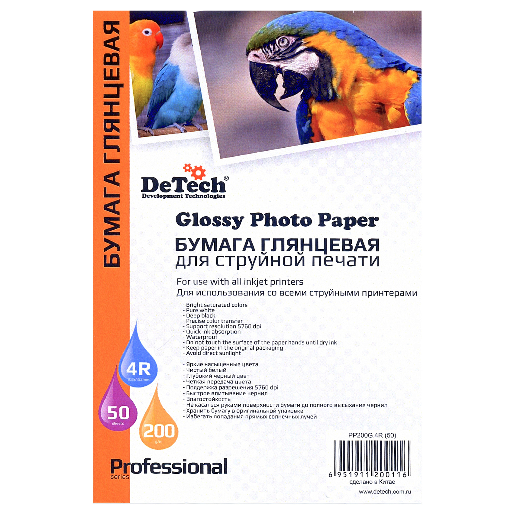 Фотобумага DeTech 200gm2, glossy, 4R, 50л (PP200G 4R 50)
