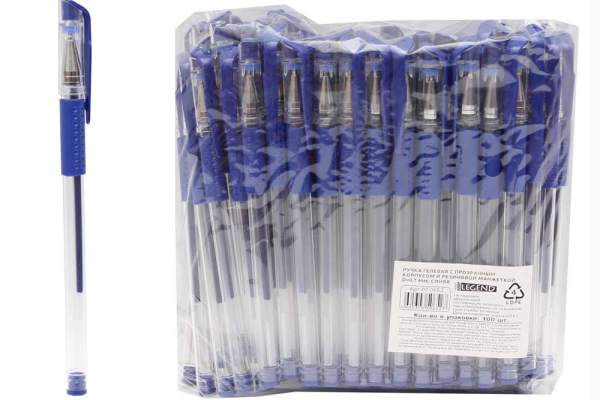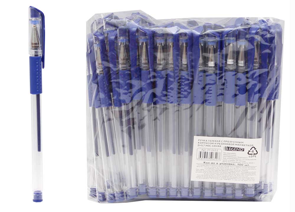 Ручка гелевая с резинкой корпус прозрачный синяя LEGEND РГ-0652