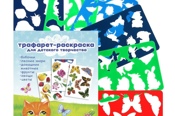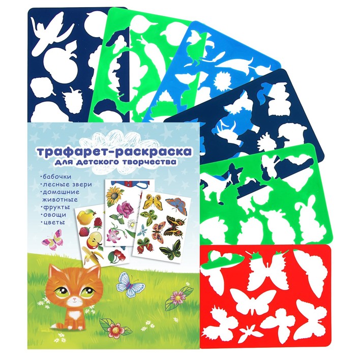 Набор трафарет-раскраска 6шт овощи, домашние животные, бабочки, лесные звери, фрукты для девочек Calligrata HTP-1/853802